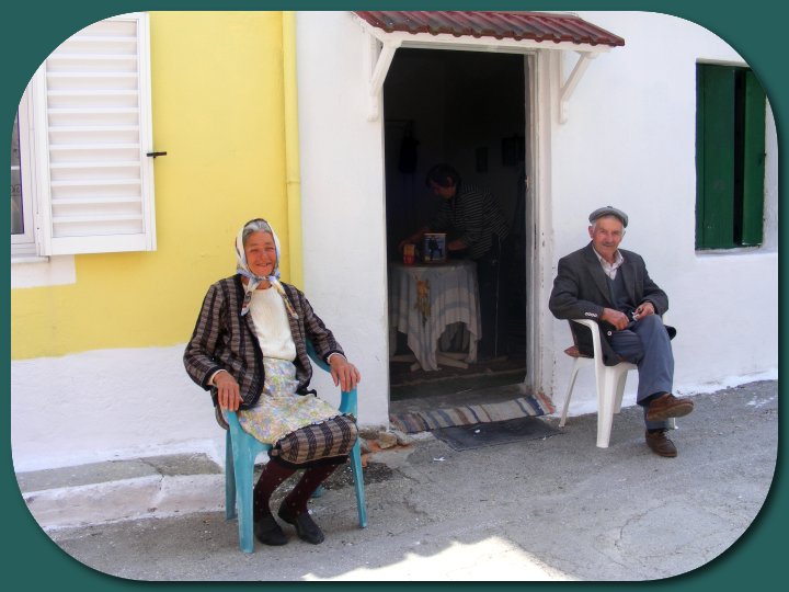 Im Schatten der Häuser sitzen alte Menschen und nehmen am Dorfleben teil.