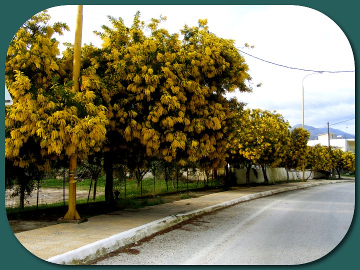 Auf dem Rückweg von Ióannina sehen wir diese Allee von Mimosen-Bäumen
