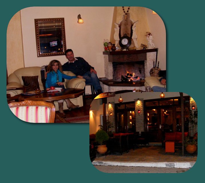 Vor dem Kamin sitzen Panagiotis und Louisa Nani. Leider spiegelt sich das Cafe in dem Glas des großen Bildes. Sie haben schöne griechische Motive in ihrem Lokal aufgehängt. ![]() |