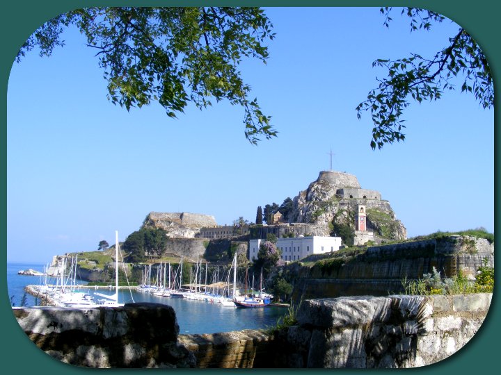 Schöner Blick auf die alte Festung in Corfu-Town vom Garten des Museums